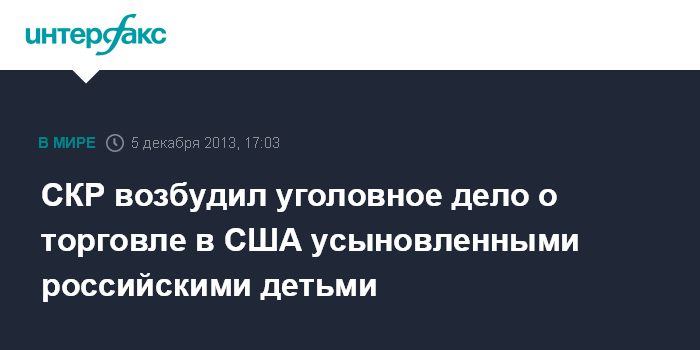 Москва. 5 декабря. INTERFAX.RU - Следственный комитет РФ возбудил уголовное дело по факту торговли в США детьми, которые были усыновлены в России.