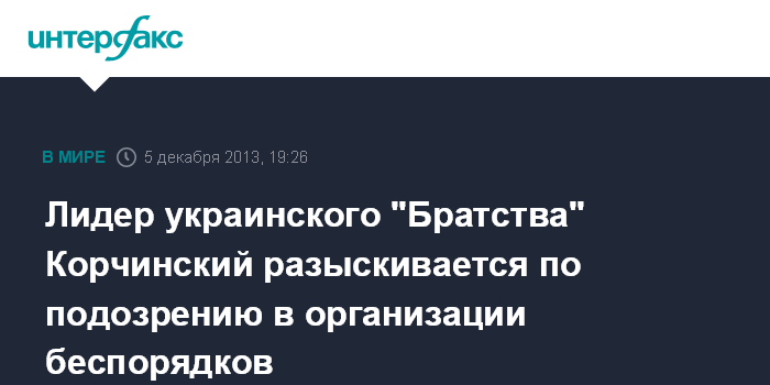 Киев. 5 декабря. INTERFAX.RU - Лидеру партии "Братство" Дмитрию Корчинскому предъявлено подозрение по статье Уголовного кодекса Украины, касающееся организации массовых беспорядков на ул.Банковой 1 декабря, он находится в розыске, заявил зампрокурора Киева Сергей Софиев.