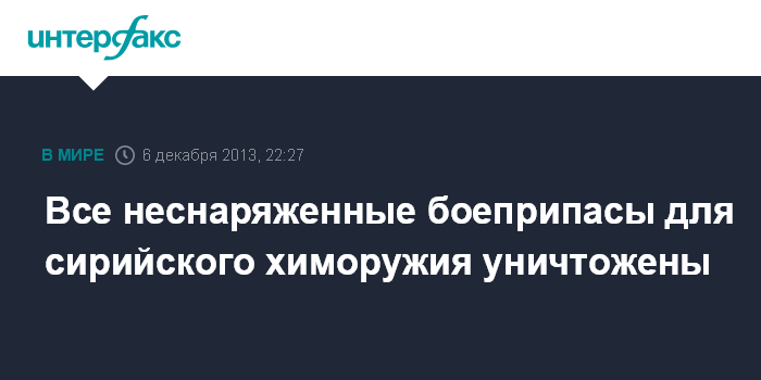 Брюссель. 6 декабря. INTERFAX.RU - Организация по запрещению химического оружия (ОЗХО) подтвердила факт уничтожения всех неснаряженных боеприпасов для химоружия в Сирии.