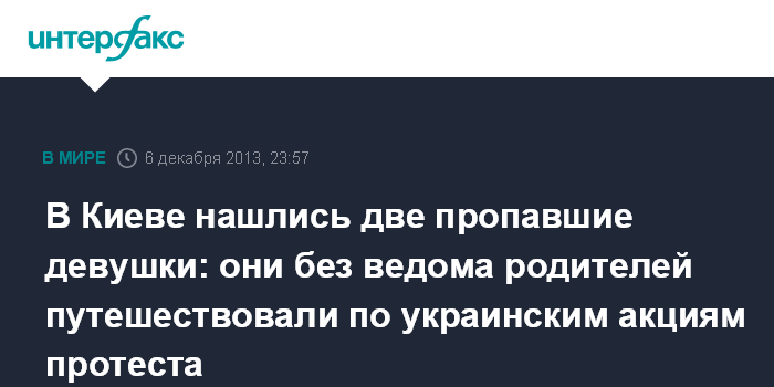 Киев. 6 декабря. ИНТЕРФАКС-УКРАИНА - Две жительницы украинского города Бровары (Киевская область), 16 и 18 лет, около недели назад без уведомления родителей покинули свои дома, чтобы поучаствовать в акциях протеста в Одессе, Львове и Киеве.