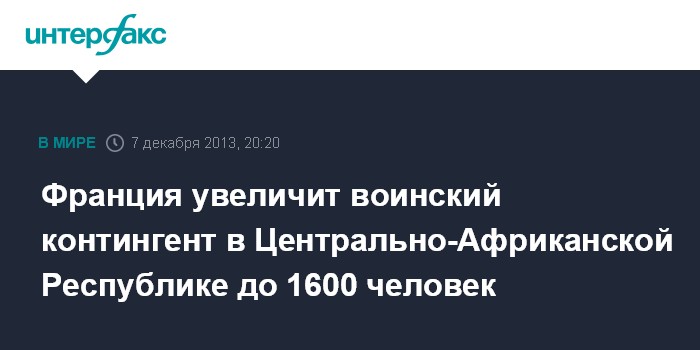 Париж. 7 декабря. INTERFAX.RU - Президент Франции Франсуа Олланд заявил о решении командировать в Центрально-Африканскую Республику еще 600 французских военнослужащих.