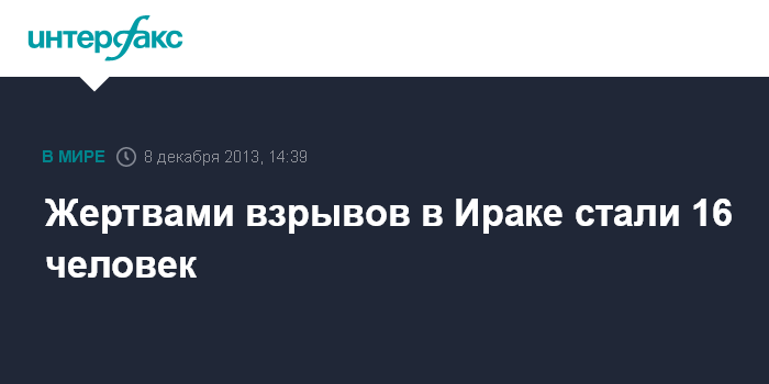 Дубай. 8 декабря. INTERFAX.RU - По меньшей мере 16 человек погибли в результате серии взрывов в Ираке, сообщает в воскресенье ливанская газета The Daily Star. По информации издания, еще не менее 39 человек получили ранения.