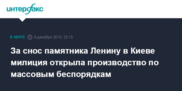 Киев. 8 декабря. ИНТЕРФАКС-УКРАИНА - На Украине правоохранители открыли уголовное производство по статье "массовые беспорядки" в связи со сносом памятника Ленину на Бессарабской площади в Киеве.