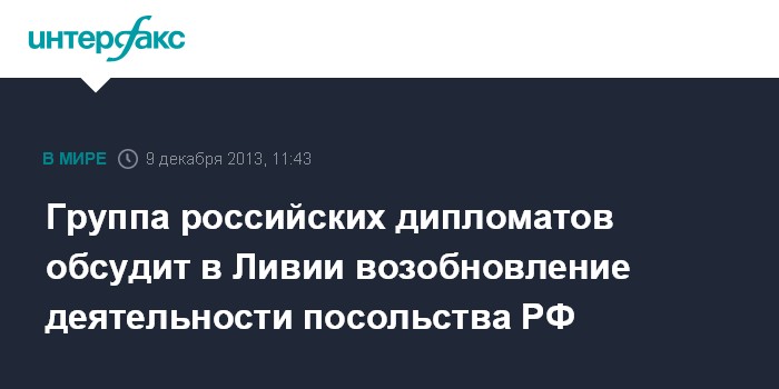 Москва. 9 декабря. INTERFAX.RU - Вопрос о возобновлении деятельности посольства России в Ливии рассмотрит передовая группа российских дипломатов, которая 8 декабря прибыла в Триполи, сообщает МИД РФ.
