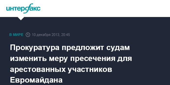 Киев. 10 декабря. INTERFAX.RU - Генпрокуратура изучает возможность избрания некоторым ранее арестованным лицам менее жесткой меры пресечения, первоочередные следственные действия в уголовном производстве по нарушениям общественного порядка и провокаций во время проведения мирных акций в Киеве завершены. "Сейчас органами прокуратуры Киева изучается возможность избрания некоторым ранее арестованным лицам менее жесткой меры пресечения", - говорится в сообщении пресс-службы Генпрокуратуры.