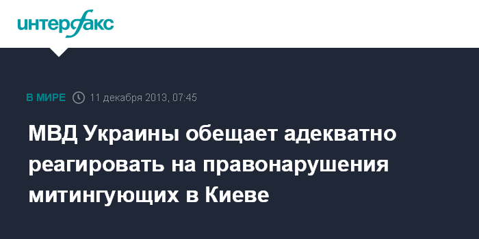 Киев. 11 декабря. ИНТЕРФАКС-УКРАИНА - Министерство внутренних дел Украины призывает митингующих в Киеве не поддаваться на провокации, не совершать правонарушений, и уверяет, что милиция будет адекватно реагировать на правонарушения в пределах полномочий, предоставленных законом Украины "О милиции".