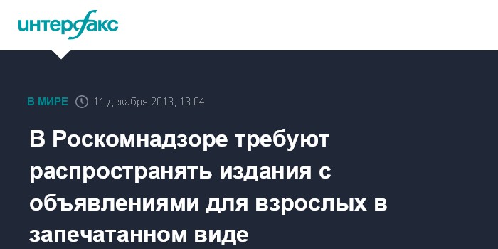 Москва. 11 декабря. INTERFAX.RU - Средства массовой информации, публикующие объявления для взрослых, должны распространяться под маркировкой 18+ в запечатанных упаковках, сообщили "Интерфаксу" в пресс-службе Роскомнадзора в среду.