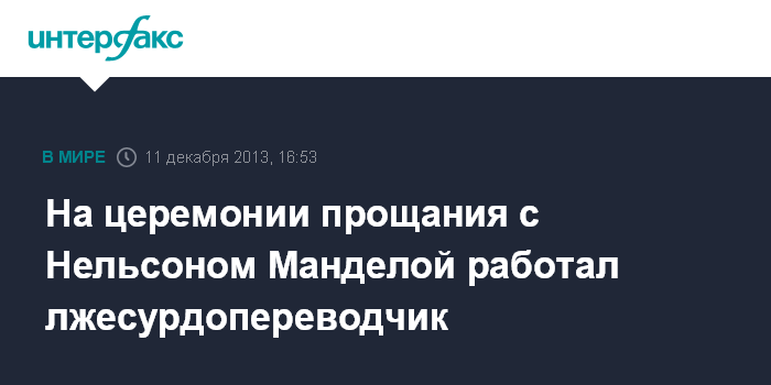 Вашингтон. 11 декабря. INTERFAX.RU - Мужчина, осуществлявший перевод на язык жестов речи мировых лидеров на церемонии прощания с экс-президентом ЮАР Нельсоном Манделой, был самозванцем, сообщает в среду агентство AP со ссылкой на Южно-Африканскую федерацию глухих.