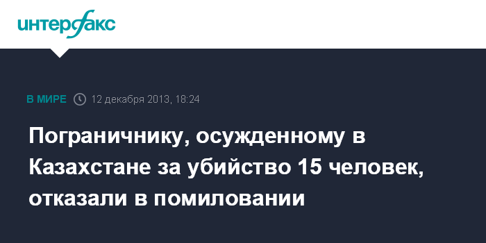 Алматы. 12 декабря. INTERFAX.RU - Казахстанскому пограничнику Владиславу Челаху, приговоренному к пожизненному лишению свободы за убийство 15 человек, в помиловании отказано, сообщил в четверг "Интерфаксу" адвокат осужденного Серик Сарсенов.