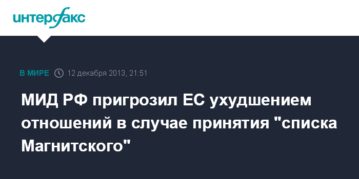 МИД РФ пригрозил ЕС ухудшением отношений в случае принятия "списка Магнитского"