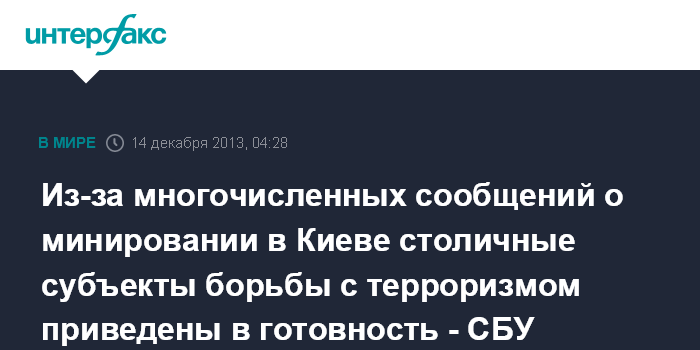 Киев. 14 декабря. ИНТЕРФАКС-УКРАИНА - В связи с неоднократными анонимными сообщениями в Киеве о минировании объектов с массовым пребыванием людей и угрозами осуществления взрывов в ноябре и декабре нынешнего года Антитеррористический центр при СБУ привел в готовность субъекты борьбы с терроризмом на территории Киевского региона, сообщает пресс-служба ведомства.