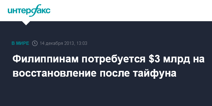 Гонконг. 14 декабря. INTERFAX.RU - Властям Филиппин необходимо почти $3 млрд для восстановления районов, пострадавших от разрушительного тайфуна "Хайян", заявил президент страны Бенигно Акино. "Перед нами стоит очень серьезная задача. Вот почему нам потребуется около 130 млрд песо ($2,94 млрд), чтобы улучшить жизнь людей", - проводятся слова Б.Акино в заявлении президентского дворца.
