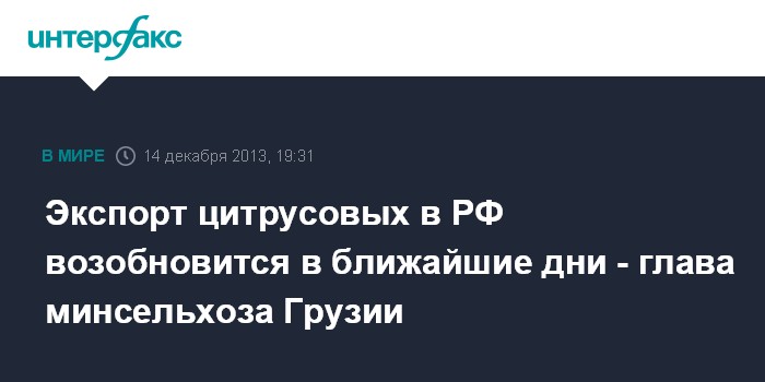 Тбилиси. 14 декабря. INTERFAX.RU - Поставки цитрусовых из Грузии в Россию, которые временно были приостановлены из-за сильного снегопада и шторма на море, возобновятся в ближайшие дни, заявил министр сельского хозяйства республики Шалва Пипия.