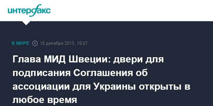 Киев. 15 декабря. ИНТЕРФАКС-УКРАИНА - Глава Министерства иностранных дел Швеции Карл Бильдт заявляет, что двери Украине для подписания Соглашения об ассоциации с Европейским Союзом "широко открыты".