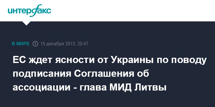 Киев. 15 декабря. ИНТЕРФАКС-УКРАИНА - Министр иностранных дел Литвы Линас Линкявичюс заявил, что европейской стороне нужна ясность в вопросе подписания Соглашения об ассоциации Украина-ЕС.