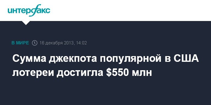 Вашингтон. 16 декабря. INTERFAX.RU - Сумма джекпота одной из самых популярных лотерей США Mega Millions за один день увеличилась с $425 млн до $550 млн, сообщает в понедельник агентство Associated Press.