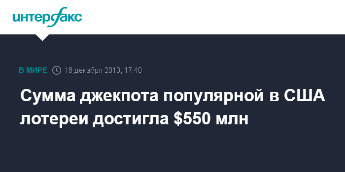 Вашингтон. 16 декабря. INTERFAX.RU - Сумма джекпота одной из самых популярных лотерей США Mega Millions за один день увеличилась с $425 млн до $550 млн.