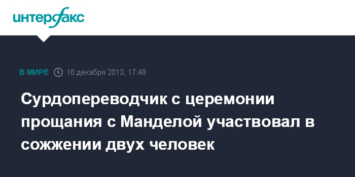 Вашингтон. 16 декабря. INTERFAX.RU - Мужчина, переводивший на язык жестов речи мировых лидеров на церемонии прощания с экс-президентом ЮАР Нельсоном Манделой, предположительно, причастен к сожжению двух человек.