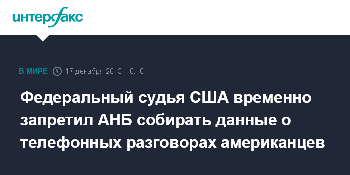 Вашингтон. 17 декабря. INTERFAX.RU - Федеральный судья США Ричард Леон постановил прекратить сбор Агентством национальной безопасности (АНБ) информации о телефонных разговорах двух американцев, сообщает телеканал Fox News.