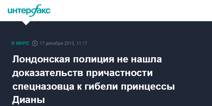Лондон. 17 декабря. INTERFAX.RU - Скотленд-Ярд не обнаружил свидетельств, доказывающих причастность спецназовца из специальной воздушной службы британских ВВС (САС) к гибели принцессы Уэльской Дианы в 1997 году, сообщают во вторник британские СМИ.