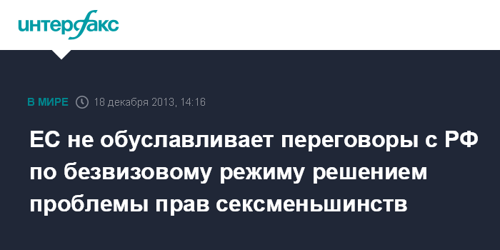 Москва. 18 декабря. INTERFAX.RU - Либерализация российского законодательства в сфере защиты прав сексуальных меньшинств не является условием для переговоров между Россией и ЕС по безвизовому режиму, заявил глава представительства Еврокомиссии в Москве Вигаудас Ушацкас.