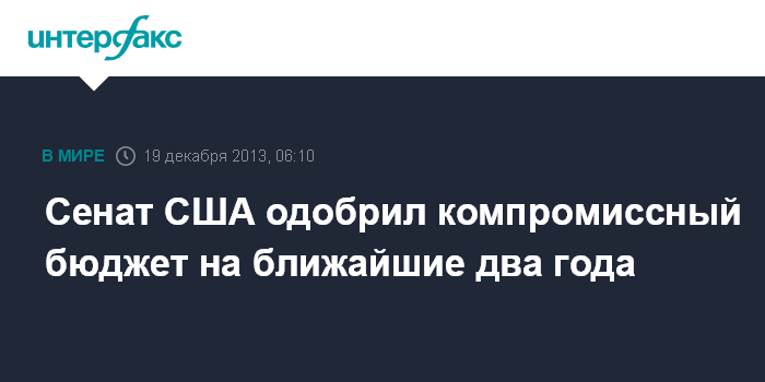 Москва. 19 декабря. INTERFAX.RU - Верхняя палата Конгресса США в среду 64 голосами "за" (все демократы Сената плюс 9 республиканцев) при 36 "против" одобрила компромиссный бюджет США, повышающий бюджетные расходы на $62-63 млрд на два года.
