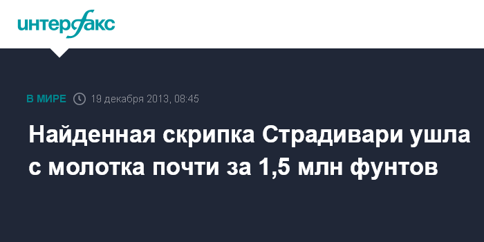 Москва. 19 декабря. INTERFAX.RU - Украденная в 2010 г. в Лондоне скрипка Страдивари, которую позднее удалось найти, была продана с аукциона за 1,385 млн фунтов стерлингов, сообщает в среду британское издание The Guardian.