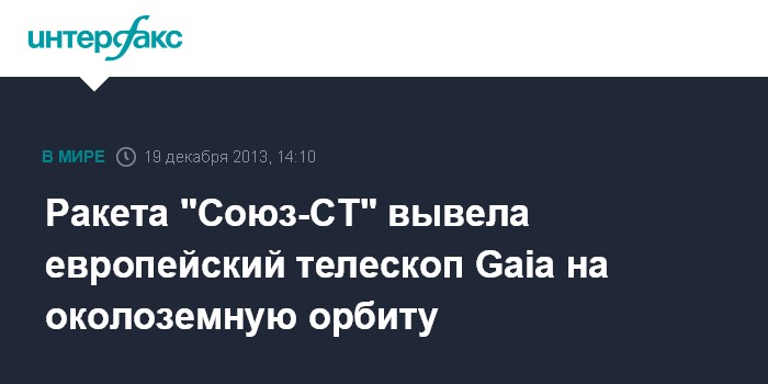 Москва. 19 декабря. INTERFAX.RU - Европейский космический аппарат для составления 3D-карты Млечного Пути Gaia отделился от российской ракеты-носителя "Союз-СТ-Б", стартовавшей около десяти минут назад с космодрома Куру Гвианского космического центра (Южная Америка), сообщили "Интерфаксу" в Роскосмосе.
