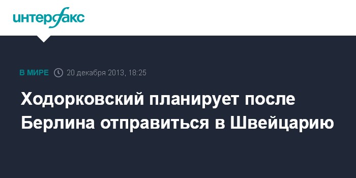 Москва. 20 декабря. INTERFAX.RU - Бывший глава НК "ЮКОС" Михаил Ходорковский, освобожденный в пятницу на основании указа президента РФ о помиловании, намерен после Берлина отправиться в Швейцарию, сообщила онлайн-версия журнала Spiegel.