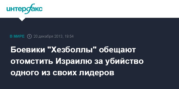 Москва. 20 декабря. INTERFAX.RU - Глава ливанского шиитского движения "Хезболла" Хасан Насралла пригрозил наказать Израиль, который он считает ответственным за убийство одного из своих лидеров движения Хасана аль-Лакиса, передает в пятницу агентство EFE.