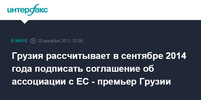 Тбилиси. 20 декабря. ИНТЕРФАКС - Грузия намерена до сентября 2014 года выполнить все необходимые процедуры для подписания соглашения об ассоциации с Евросоюзом, заявил премьер-министр Грузии Ираклий Гарибашвили.