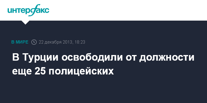 Москва. 22 декабря. INTERFAX.RU - Власти Турции освободили от должности еще 25 высокопоставленных полицейских. Всего с начала операции "Большая взятка" 17 декабря от должности были отстранены почти 70 силовиков. Среди них глава управления безопасности Стамбула Хюсейин Чапкын, сообщают "Вести" .