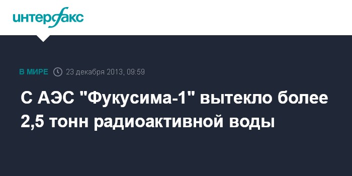Москва. 23 декабря. INTERFAX.RU - Утечка примерно 2,6 тонн радиоактивной воды зафиксирована на аварийной АЭС "Фукусима-1" в Японии, сообщает местный телеканал NHK.