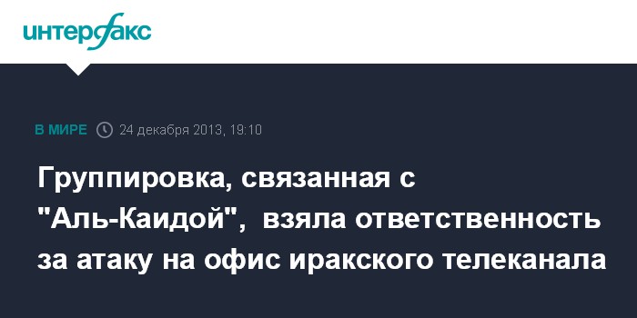 Москва. 24 декабря. INTERFAX.RU - Радикальная группировка "Исламское государство Ирака и Леванта" взяла на себя ответственность за атаку на центральный офис телеканала провинции Салах-эд-Дин в городе Тикрите на севере Ирака, заявили во вторник боевики на ряде исламистских сайтов.