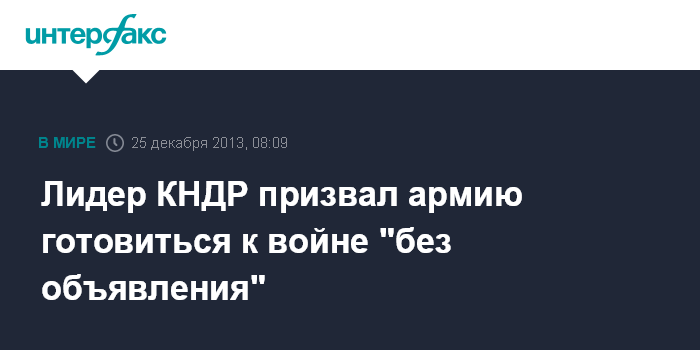 Москва. 25 декабря. INTERFAX.RU - Руководитель КНДР Ким Чен Ын призвал армию сохранять высокую степень боеготовности в связи с тем, что война может начаться без объявления.