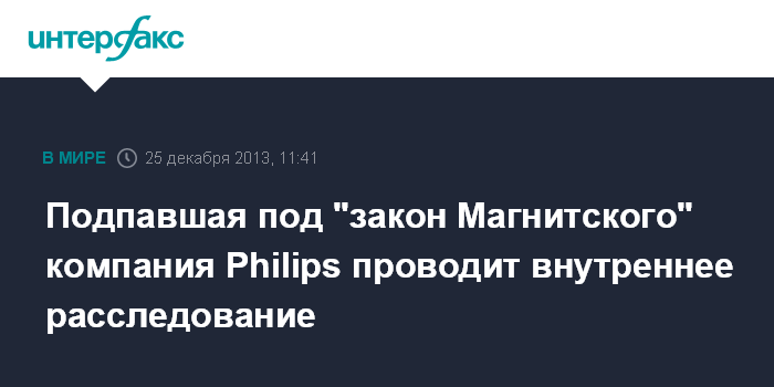 Москва. 25 декабря. INTERFAX.RU - Нидерландская Koninklijke Philips N.V. объявила о расследовании деятельности подразделений в США и России, операции которых подпадают под санкции США по "закону Магнитского", пишет Risk & Compliance Journal.