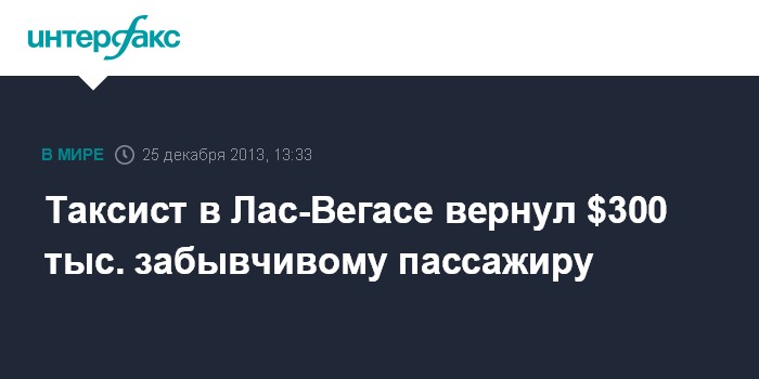 Вашингтон. 25 декабря. INTERFAX.RU - Шофер такси в американском городе Лас-Вегас (штат Невада) вернул владельцу забытые в автомобиле $300 тыс., сообщает в среду веб-сайт газеты Vegas Sun.