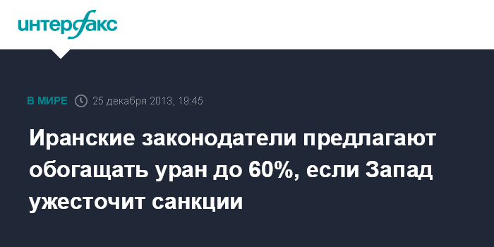 Москва. 25 декабря. INTERFAX.RU - Группа иранских депутатов вынесла на рассмотрение президиума парламента законопроект, предусматривающий обогащение урана до 60% в случае, если иностранные державы попытаются ввести новые санкции в отношении Тегерана, сообщает в среду иранский телеканал Press TV.