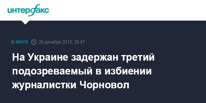 Москва. 26 декабря. INTERFAX.RU - Задержан третий подозреваемый в избиении журналистки Татьяны Чорновол, сообщает управление по связям с общественностью МВД Украины в четверг.