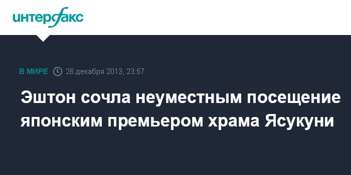 Москва. 27 декабря. INTERFAX.RU - Верховный представитель ЕС по иностранным делам Кэтрин Эштон считает, что посещение 26 декабря японским премьер-министром Синдзо Абэ храма Ясукуни в Токио не способствует снижению напряженности в регионе или улучшению отношений Японии с ее соседями, особенно Китаем и Южной Кореей.