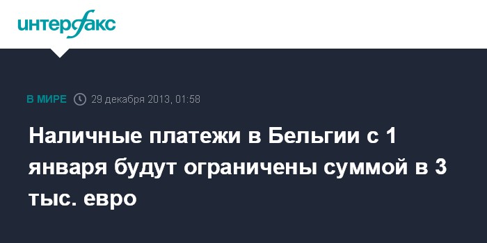Брюссель. 29 декабря. ИНТЕРФАКС - Максимальная сумма наличными, которую можно будет выплатить в Бельгии за услуги или покупки с 1 января, согласно решению правительства, не должна превышать 3 тыс. евро, передают в воскресенье местные СМИ.
