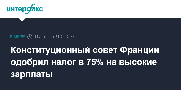 Москва. 30 декабря. INTERFAX.RU - Конституционный совет Франции, высший орган конституционного контроля, признал законным предложение обязать компании выплачивать налог в размере 75% от зарплат, превышающих 1 млн евро в год, сообщает MarketWatch.