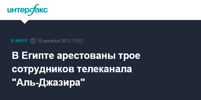 Москва. 30 декабря. INTERFAX.RU - Сотрудники египетской службы национальной безопасности арестовали трех работников катарского телеканал "Аль-Джазира" по подозрению в связях с представителями движения "Братья-мусульмане", заявили в понедельник в МВД Египта.