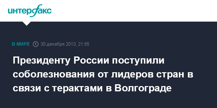 Москва. 30 декабря. INTERFAX.RU - Президенту Российской Федерации Владимиру Путину поступили соболезнования от лидеров зарубежных государств и руководителей международных организаций в связи с террористическими актами, совершенными в Волгограде, сообщает в понедельник пресс-служба Кремля.