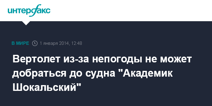 Москва. 1 января. INTERFAX.RU - Вертолет с китайского судна Xue Long из-за ухудшения погоды не может вылететь в район Антарктиды, где в ледовом плену оказалось российское научно-исследовательское судно "Академик Шокальский".
