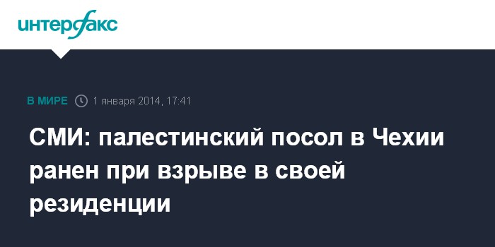 Москва. 1 января. INTERFAX.RU - Палестинский посол в Чехии получил серьезные ранения из-за взрыва, произошедшего на территории его резиденции в Праге, передают в среду западные СМИ.