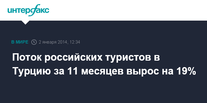 Москва. 2 января. INTERFAX.RU - Турцию за 11 месяцев 2013 года посетили более 4,2 млн российских туристов, что на 18,8% больше показателя прошлого года за аналогичный период, сообщает министерство культуры и туризма Турции.
