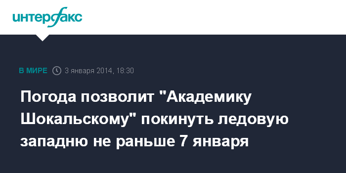 Москва. 3 января. INTERFAX.RU - Благоприятные погодные условия, необходимые для освобождения российского экспедиционного судна "Академик Шокальский" из ледового плена, ожидаются лишь 7-8 января, сообщает пресс-служба Арктического и Антарктического научно-исследовательского института.