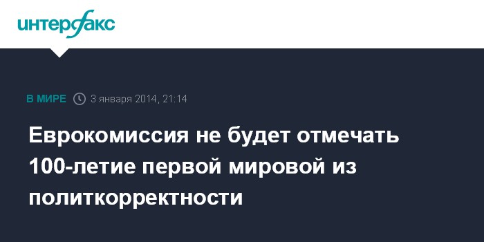 Брюссель. 3 января. ИНТЕРФАКС - Памятные мероприятия в связи со столетней годовщиной начала первой мировой войны рискуют пробудить рецидивы национализма из-за разной трактовки конфликта воевавшими государствами, поэтому Еврокомиссия не намерена организовывать никаких торжеств по этому случаю.
