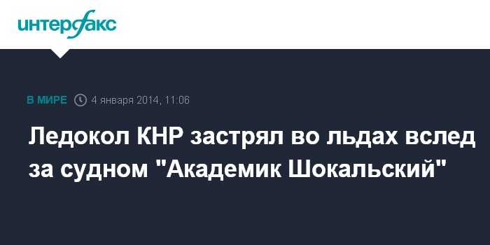 Москва. 4 января. INTERFAX.RU - Китайский ледокол Xue Long, принимавший участие в эвакуации пассажиров с заблокированного антарктическими льдами российского научного судна "Академик Шокальский", сам оказался в ледовом плену, передает британская телерадиокорпорация BBC.
